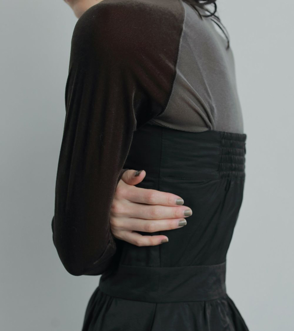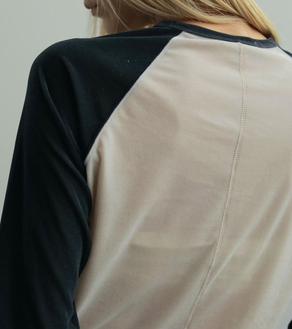 メンズライクなベースボールTシャツをベロア素材で仕上げることで上品な装いに。