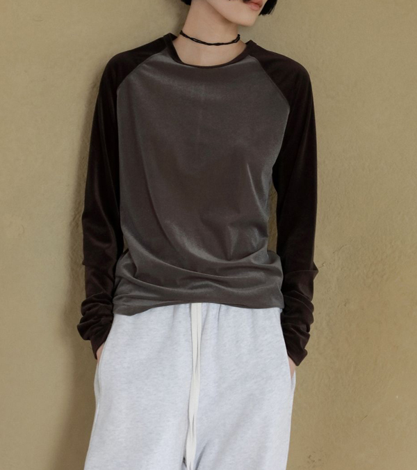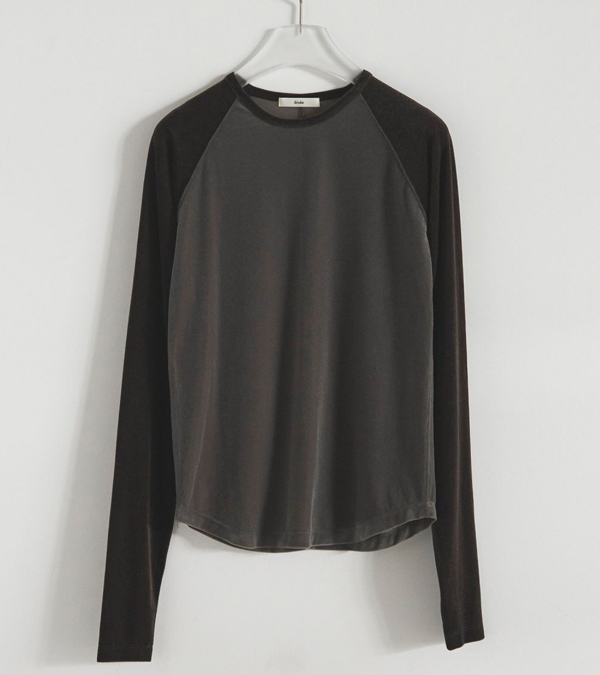 透け感のある薄手のベロア素材を使ったベースボールTシャツ。