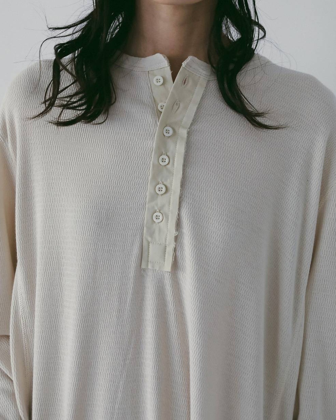 ヘンリーデザインのフロントは前立て部分を別布で切り替え、さりげない表情をプラスしました。