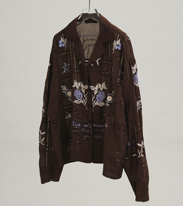 13種類もの刺繍をふんだんにあしらったパッチワークが目を惹く開襟シャツ。