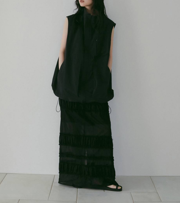 アーム周りを程よくカバーした、ノースリーブとしても取り入れやすいバランスで